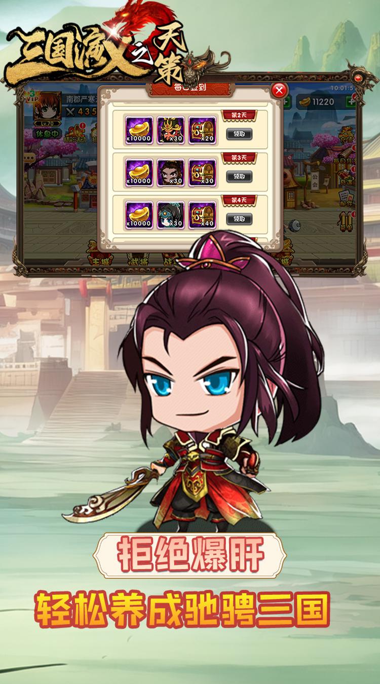 1:上线即领丰厚物资:进入游戏,立即领取银币10000、元宝500,以及强化石、进阶丹、升阶石等实用道具,助你冒险快人一步。还有全新直升70级道具卡,使用后瞬间直升70级。 2:开服狂撒福利:开服狂欢期间,每日登录都能领取充值卡,累计收获万元充值卡。,福利拿到手软。 3:充值折扣超划算:首充、续充低至0.05折,充值比例1:10,花小钱,得大资源。开局便能直升70级,快速融入游戏。 4:轻松打造无敌阵容:凭借海量福利,轻松培养武将、打造顶级装备,组建称霸三国的无敌阵容。叫上好友一起玩,并肩作战,在三国世界大杀四方!